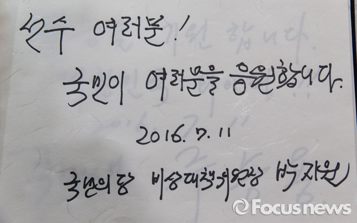 (서울=포커스뉴스) 박지원(가운데) 국민의당 비상대책위원장이 11일 오후 서울 노원구 태릉선수촌에 방문해 남긴 방명록.