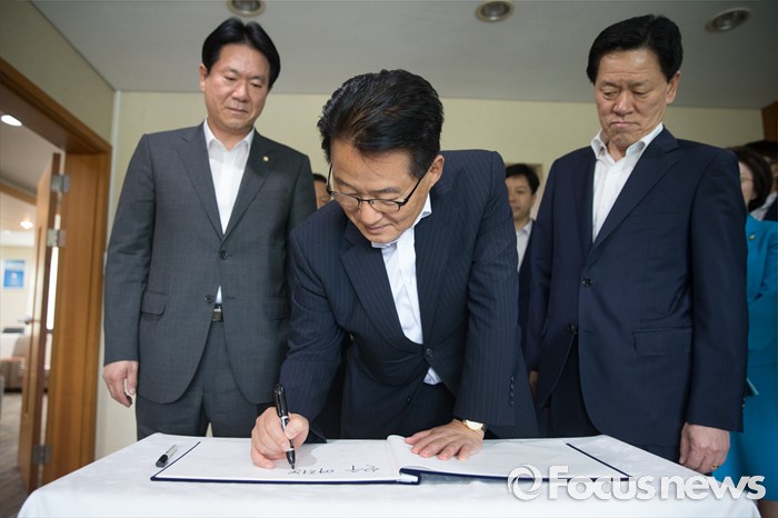 (서울=포커스뉴스) 박지원(가운데) 국민의당 비상대책위원장이 11일 오후 서울 노원구 태릉선수촌에 방문해 방명록을 적고 있다.