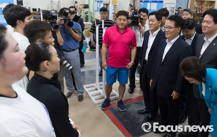 | △ 역도 국가대표 선수들 격려하는 박지원 |