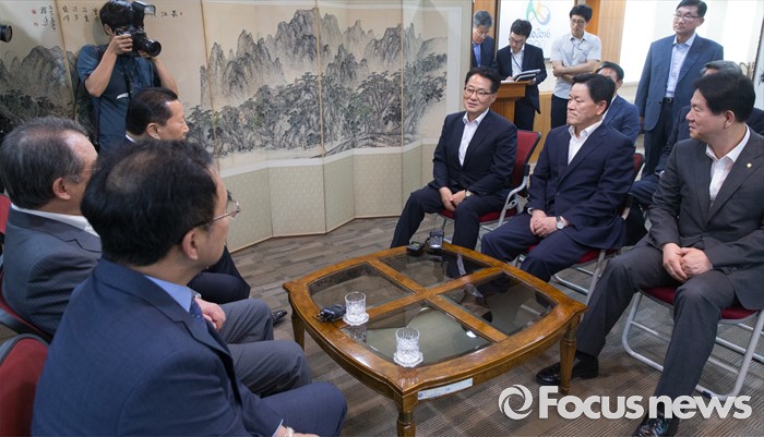 (서울=포커스뉴스) 박지원(오른쪽 세번쨰) 국민의당 비상대책위원장을 비롯한 주요 당직자들이 11일 오후 서울 노원구 태릉선수촌에 방문해 김정행 대한체육회 공동회장 등 참석자들과 대화 나누고 있다.