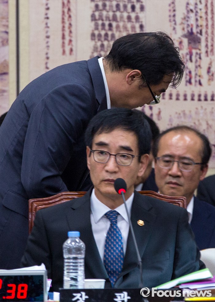 (서울=포커스뉴스) 민중을 개, 돼지로 표현한 발언으로 비판을 받고 있는 나향욱 교육부 정책기획관이 11일 오후 서울 여의도 국회에서 열린 교육문화체육관광위원회 전체회의에 참석해 질의응답을 마친 뒤 고개 숙인 채 자리로 돌아가고 있다.