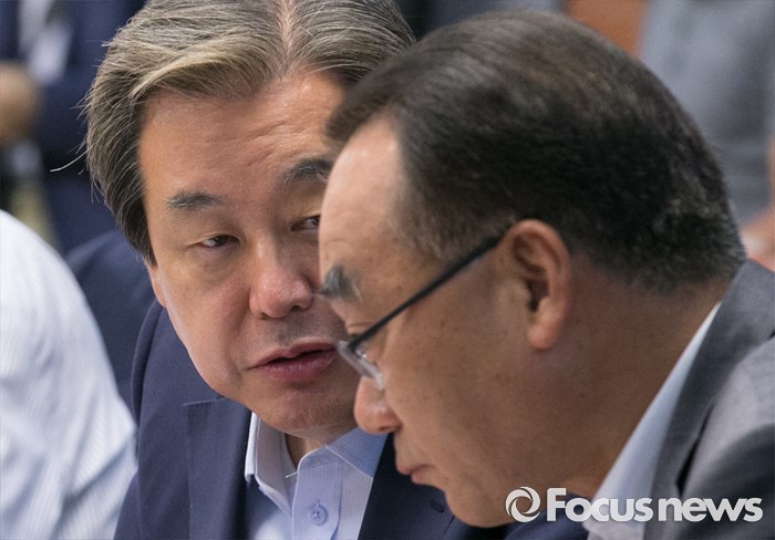 (서울=포커스뉴스) 12일 오전 서울 여의도 국회 의원회관에서 국가전략포럼 주최로 열린 국민이 바라는 개헌, 어떻게 할 것인가? 세미나에 참석한 김무성(왼쪽) 새누리당 전 대표와 박재완 한반도선진화재단 이사장이 대화하고 있다.