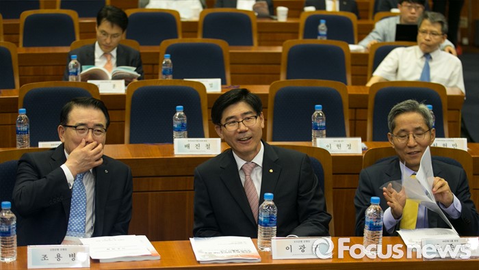 (서울=포커스뉴스) 12일 오전 서울 여의도 국회 헌정기념관에서 열린 글로벌금융학회 정책심포지엄에 참석한 윤종규(오른쪽부터) KB금융그룹 회장, 이광구 우리은행장, 조용병 신한은행장이 자리하고 있다.