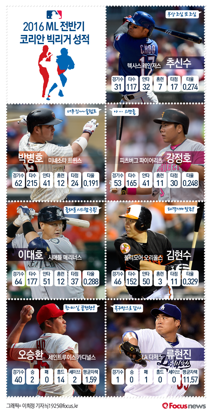 (서울=포커스뉴스) 2016 메이저리그 전반기가 마무리됐다. 추신수를 비롯해 강정호, 이대호, 김현수, 박병호, 오승환, 류현진의 전반기 성적을 살펴봤다.