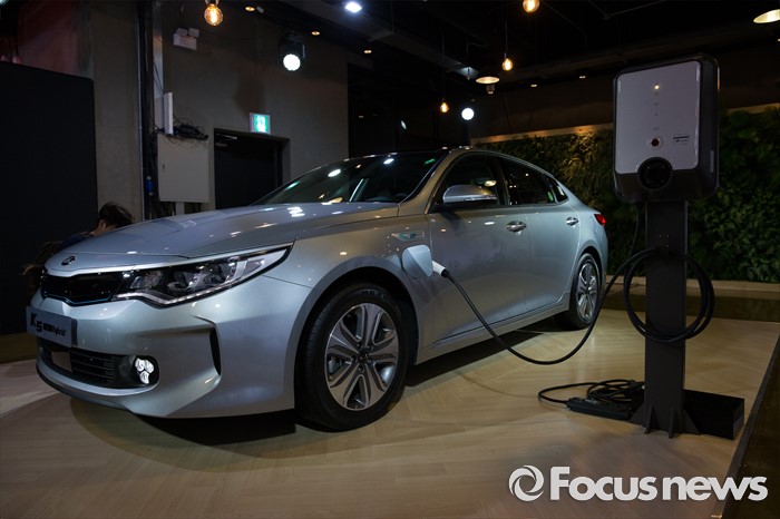 (서울=포커스뉴스) 12일 오전 서울 강남구 인터와이드 스튜디오에서 열린 '2017 K5, K5 PHEV' 출시 사진 및 영상 발표회에 K5 'PHEV' 차량이 전시되어 있다.