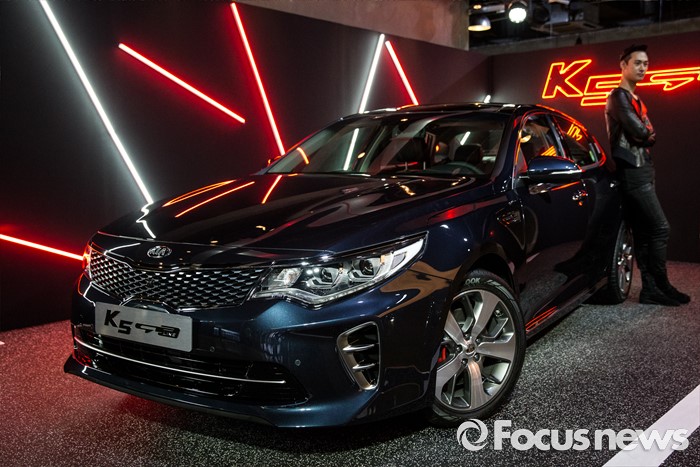 (서울=포커스뉴스) 12일 오전 서울 강남구 인터와이드 스튜디오에서 열린 '2017 K5, K5 PHEV' 출시 사진 및 영상 발표회에 K5 GT-Line 차량이 전시되어 있다.