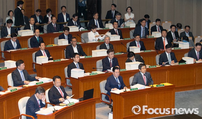 (서울=포커스뉴스) 12일 오전 서울 여의도 국회에서 2015회계연도 결산을 위해 열린 예산결산특별위원회 전체회의에 참석한 황교안 국무총리 등 국무위원들이 자리하고 있다.