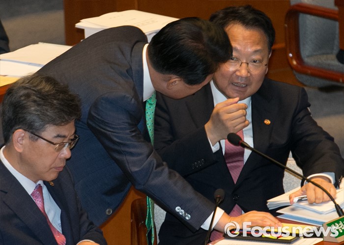 (서울=포커스뉴스) 12일 오전 서울 여의도 국회에서 2015회계연도 결산을 위해 열린 예산결산특별위원회 전체회의에 참석한 유일호(오른쪽) 경제부총리 겸 기획재정부 장관과 김한표 새누리당 의원이 대화하고 있다.
