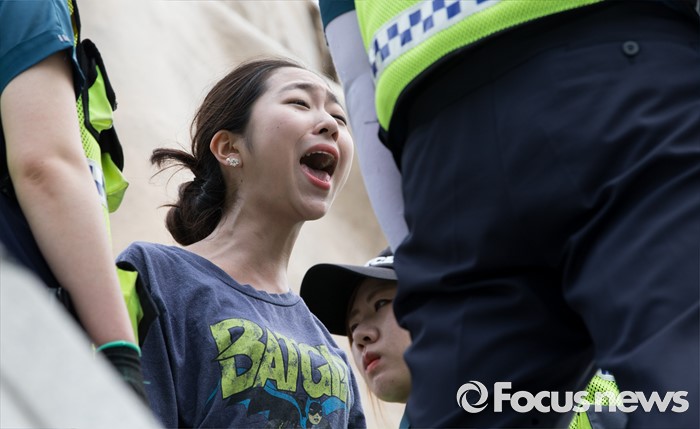 (서울=포커스뉴스) 12일 오전 서울 종로구 광화문광장 세종대왕 동상에서 알바연대알바노조가 최저임금 1만원 인상을 요구하며 기습시위를 벌이고 있다.