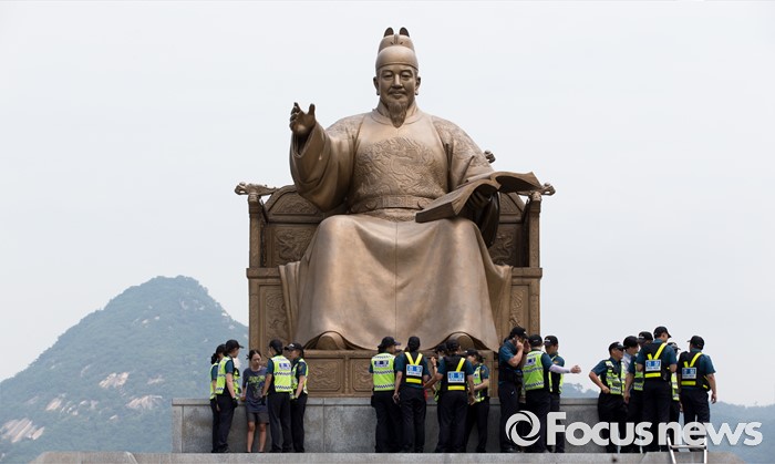 (서울=포커스뉴스) 12일 오전 서울 종로구 광화문광장 세종대왕 동상에서 알바연대알바노조가 최저임금 1만원 인상을 요구하며 기습시위를 벌이고 있다.