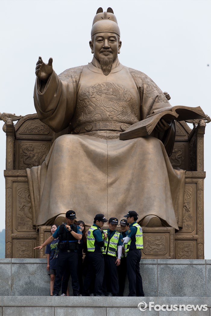 (서울=포커스뉴스) 12일 오전 서울 종로구 광화문광장 세종대왕 동상에서 알바연대알바노조가 최저임금 1만원 인상을 요구하며 기습시위를 벌이고 있다.