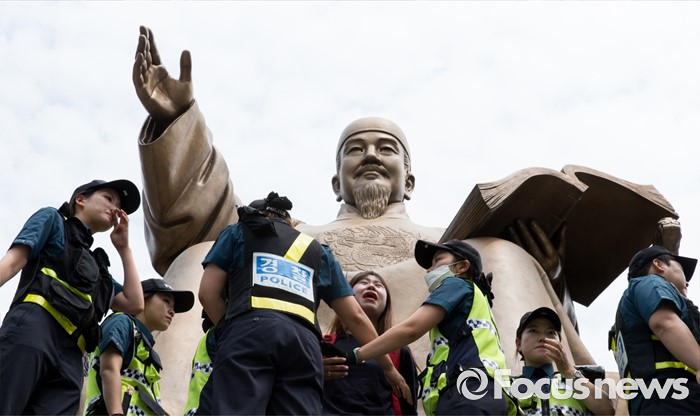 (서울=포커스뉴스) 12일 오전 서울 종로구 광화문광장 세종대왕 동상에서 알바연대알바노조가 최저임금 1만원 인상을 요구하며 기습시위를 벌이고 있다.