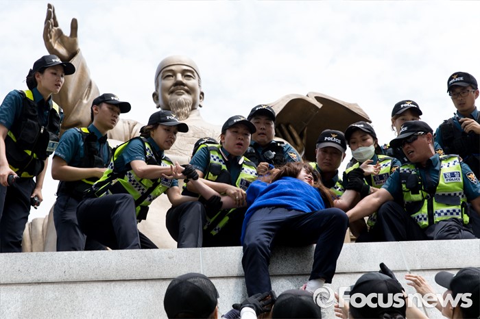 (서울=포커스뉴스) 12일 오전 서울 종로구 광화문광장 세종대왕 동상에서 최저임금 1만원 인상을 요구하며 시위를 하던 알바연대알바노조가경찰에게 연행되고 있다.