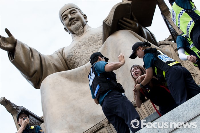 (서울=포커스뉴스) 12일 오전 서울 종로구 광화문광장 세종대왕 동상에서 알바연대알바노조가 최저임금 1만원 인상을 요구하며 기습시위를 벌이고 있다.