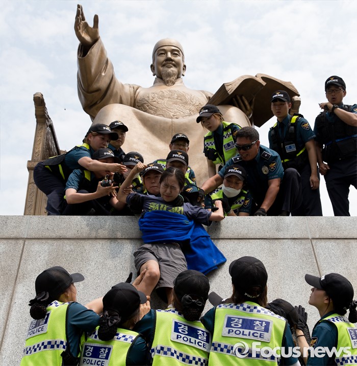 (서울=포커스뉴스) 12일 오전 서울 종로구 광화문광장 세종대왕 동상에서 최저임금 1만원 인상을 요구하며 시위를 하던 알바연대알바노조가경찰에게 연행되고 있다.
