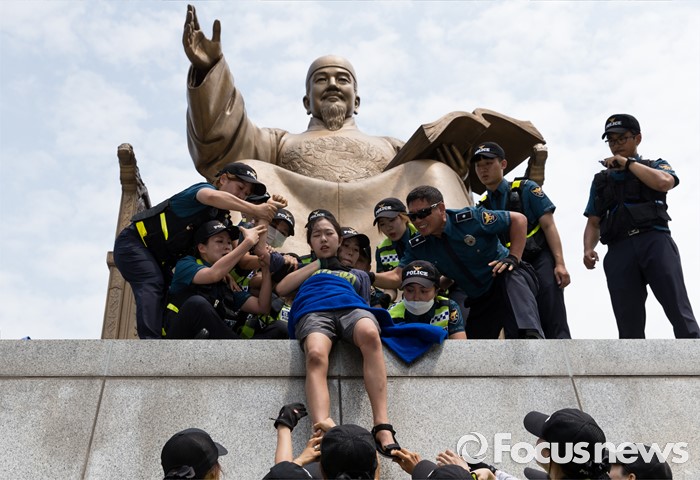 (서울=포커스뉴스) 12일 오전 서울 종로구 광화문광장 세종대왕 동상에서 최저임금 1만원 인상을 요구하며 시위를 하던 알바연대알바노조가경찰에게 연행되고 있다.