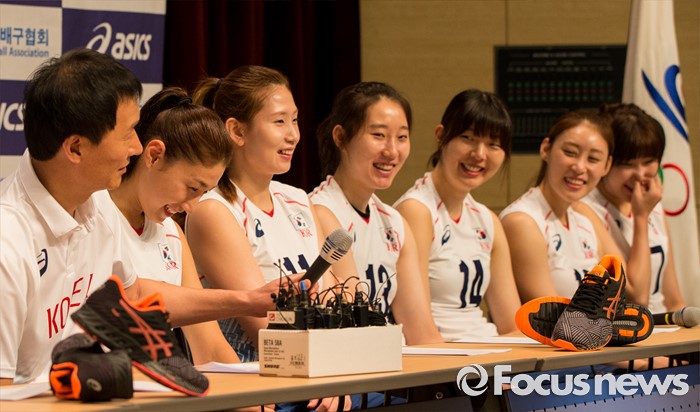 (진천=포커스뉴스) 12일 오전 충북 진천 선수촌 대강당에서 열린 '대한민국 여자배구 국가대표선수단 기자회견'에 참석한 선수들이 밝게 웃고 있다. 이날 기자회견을 가진 여자배구 선수단은 리우올림픽을 대비해 23일 네덜란드로 전지훈련을 떠날 계획이다.