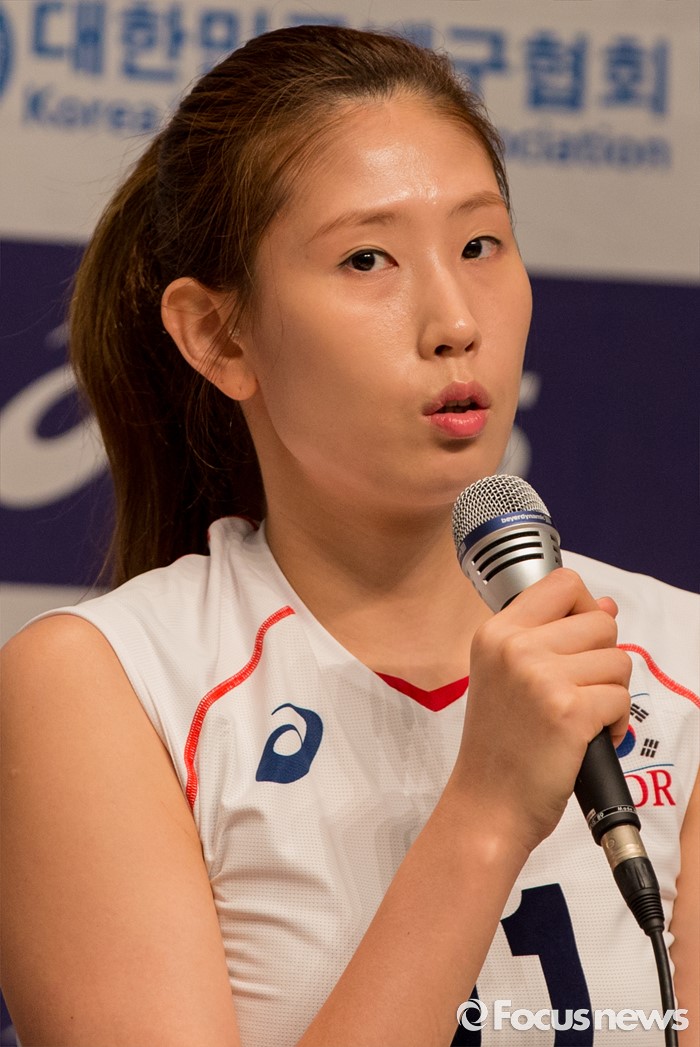 (진천=포커스뉴스) 12일 오전 충북 진천 선수촌 대강당에서 열린 '대한민국 여자배구 국가대표선수단 기자회견'에 참석한 김수지 선수가 각오를 밝히고 있다. 이날 기자회견을 가진 여자배구 선수단은 리우올림픽을 대비해 23일 네덜란드로 전지훈련을 떠날 계획이다.