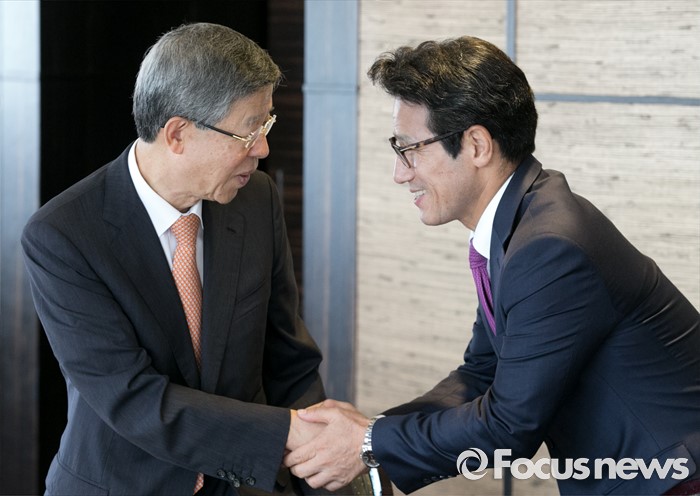 (서울=포커스뉴스) 김희옥(왼쪽) 새누리당 혁신비대위원장이 12일 오후 서울 여의도 한 중식당에서 열린 상임고문단 오찬에 참석해 전당대회 출마를 선언한 정병국 의원과 인사하고 있다.