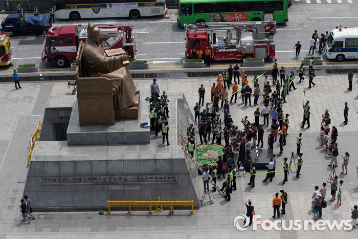 (서울=포커스뉴스) 12일 오전 서울 종로구 광화문광장 세종대왕 동상에서 알바연대알바노조가 최저임금 1만원 인상을 요구하며 기습시위를 벌이던 중 경찰들에게 제지당하고 있다.