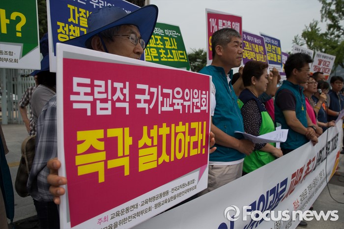 (서울=포커스뉴스) 12일 오전 서울 종로구 정부서울청사 앞에서 교육운동연대원들이 교육부 망언 고위관료 파면을 촉구하며 기자회견을 갖고 있다.
