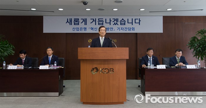 이어 이 관계자는 "산업은행 내부 인력을 키우는 데 시간이 오래 걸리기 때문"이라며 "전문인 육성과 해외인력 섭외 등 투트랙으로 가는 것"이라고 설명했다.(서울=포커스뉴스) 23일 오후 서울 영등포구 KDB산업은행 본점에서 열린 산업은행 혁신 추진방안 기자간담회에 참석한 이동걸(가운데) KDB산업은행 회장이 혁신 추진방안을 발표하고 있다. 2016.06.23 오장환 기자