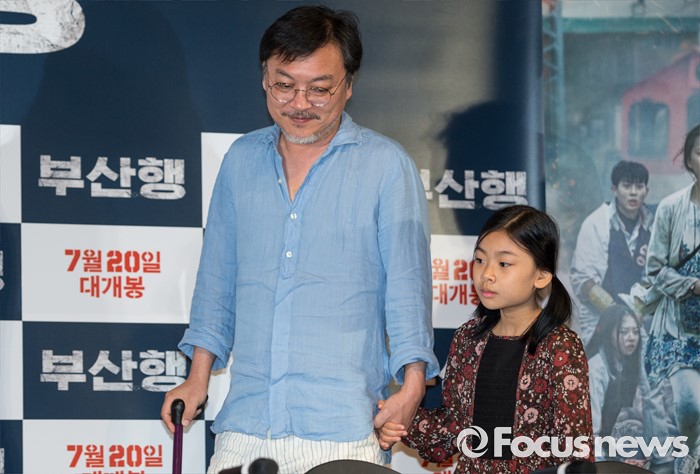 (서울=포커스뉴스) 12일 오후 서울 광진구 롯데시네마 건대입구점에서 열린 영화 '부산행' 언론시사회에 참석한 배우 김의성(왼쪽)과 김수안이 자리를 향해 이동하고 있다.