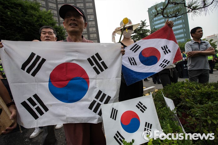 | △ 태극기 들고 자위대 창설 기념식에 맞선 시민단체 |
