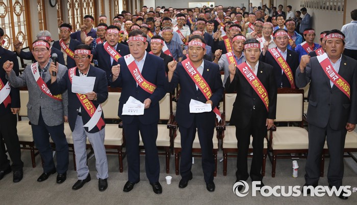 (서울=포커스뉴스) 12일 오후 경북 성주군 성주읍 성주군청에서 열린 '사드 성주 배치 반대 범군민비상대책위원회' 발대식에서 비대위원들이 성주 사드 배치 반대 구호를 외치고 있다. (사진제공=성주군)