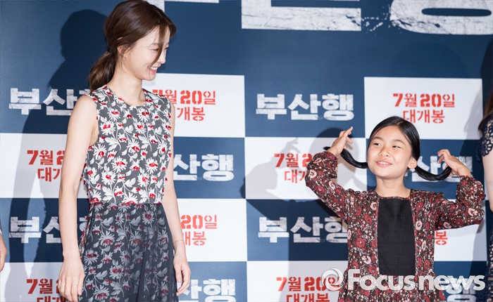 (서울=포커스뉴스) 12일 오후 서울 광진구 롯데시네마 건대입구점에서 열린 영화 '부산행' 언론시사회에 참석한 배우 정유미(왼쪽)와 김수안이 포토타임을 갖고 있다.