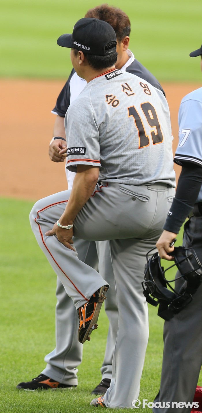 (서울=포커스뉴스) 12일 서울 잠실구장에서 열린 2016 프로야구 한화-LG 경기에서 한화 투수 송신영이 수비 동작 도중 부상당한 왼쪽 다리를 만지고 있다.