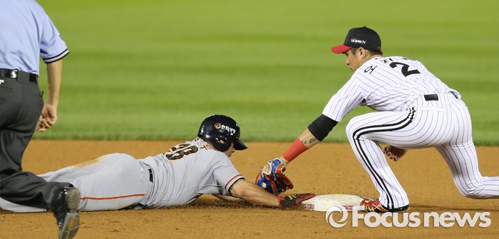 (서울=포커스뉴스) 12일 서울 잠실구장에서 열린 2016 프로야구 한화-LG 경기 6회초 1사후 한화 2루주자 양성우가 LG 포수 박재욱의 견제구에 가까스로 세이프되고 있다.