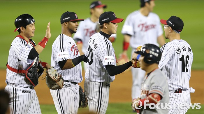 (서울=포커스뉴스) 12일 서울 잠실구장에서 열린 2016 프로야구 한화-LG 경기에서 한화에 5-4, 1점차 짜릿한 역전승을 거둔 LG 선수들이 하이파이브하고 있다.