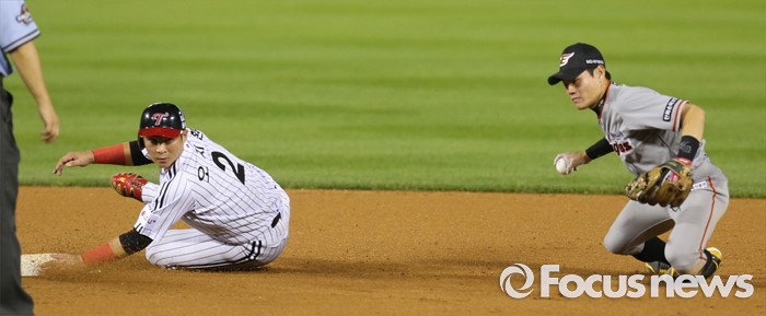 (서울=포커스뉴스) 12일 서울 잠실구장에서 열린 2016 프로야구 한화-LG 경기 6회말 1사 만루에서 LG 이병규의 2루수앞 땅볼때 1루주자 오지환이 2루에서 포스아웃되고 있다. 한화 유격수 강경학이 오지환의 발에 걸려 넘이지고 있다.