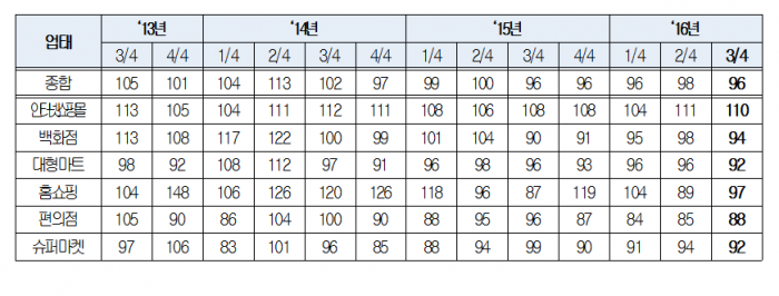 대한상공회의소는 서울과 6대 광역시 941개 소매유통체를 대상으로 '2016년 3분기 소매유통업 경기전망지수'를 조사한 결과, 3분기 전망치가 지난 분기 대비 2포인트 하락한 96으로 집계됐다고 밝혔다.