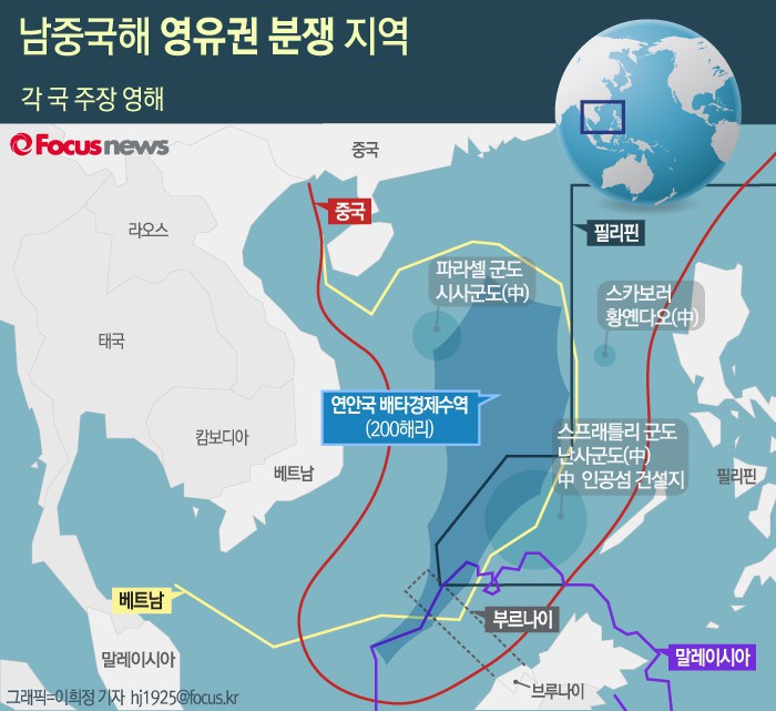 PCA는 네덜란드 헤이그에 위치한 국제 재판소로 1899년 설립됐다. 현재 112개 국가가 회원으로 있으며 국가간 분쟁 해결을 위한 가장 오래된 국제기구다. 특정 분쟁의 해결을 돕기 위한 기관으로 판결의 법적 구속력은 없다.(서울=포커스뉴스) 남중국해 부근은 중국과 베트남, 필리핀, 말레이시아 등이 서로 영유권을 주장하고 있는 분쟁지역이다. 2016.01.04 이희정 기자
