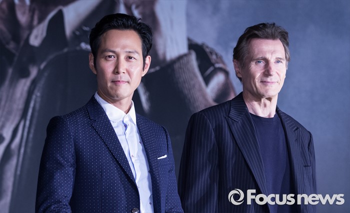 (서울=포커스뉴스) 13일 오전 서울 영등포구 콘래드 서울 호텔에서 열린 영화 '인천상륙작전' 기자간담회에 참석한 배우 이정재(왼쪽)과 리암니슨이 취재진을 바라보고 있다.