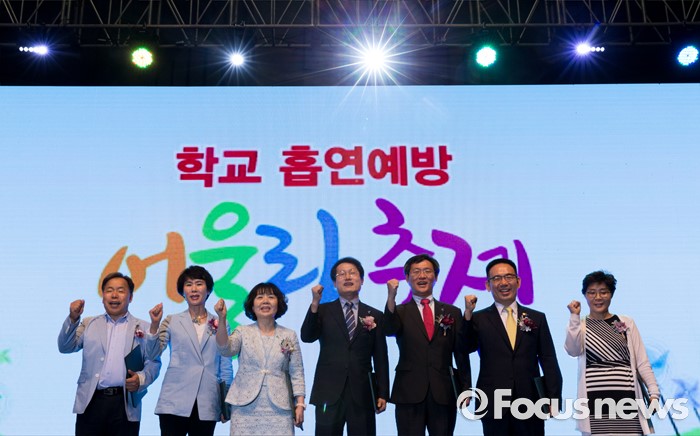 (서울=포커스뉴스) 13일 오전 서울 송파구 잠실학생체육관에서 열린 학교 흡연예방 어울림 축제에서 조희연(오른쪽 네번째) 서울시교육감이 의사회, 치과의사회등 관계기관장들과 MOU 체결 후 파이팅을 외치고 있다.
