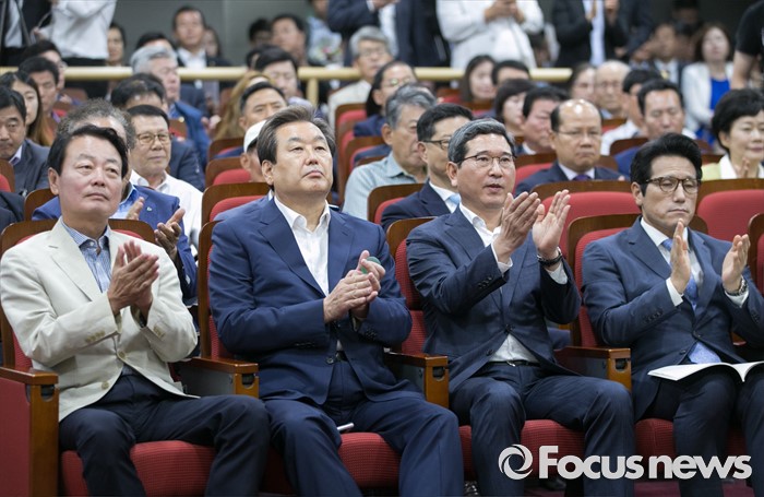 (서울=포커스뉴스) 13일 오전 서울 여의도 국회 의원회관에서 열린 대한민국 미래혁신포럼 창립기념 특강에 참석한 한선교(왼쪽부터), 김무성, 김학용, 정병국 새누리당 의원이 박수치고 있다.