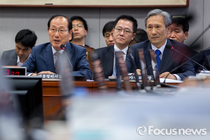 (서울=포커스뉴스) 이원종(왼쪽) 대통령비서실 비서실장이 13일 오전 서울 여의도 국회에서 열린 '운영위원회 전체회의'에 참석해 질의응답 하고 있다.