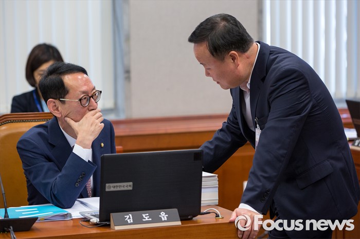 (서울=포커스뉴스) 국회 운영위원회 새누리당 간사인 김도읍(왼쪽) 원내수석부대표와 김재원 대통령비서실 정무수석이 13일 오전 서울 여의도 국회에서 열린 '운영위원회 전체회의'에 참석해 대화 하고 있다.
