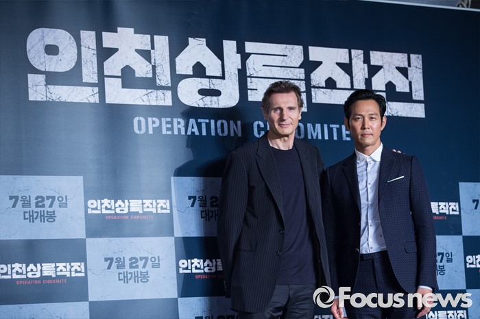 (서울=포커스뉴스) 13일 오전 서울 영등포구 콘래드 서울 호텔에서 열린 영화 '인천상륙작전' 기자간담회에 참석한 배우 리암 니슨(왼쪽)과 이정재가 포토타임을 갖고 있다.