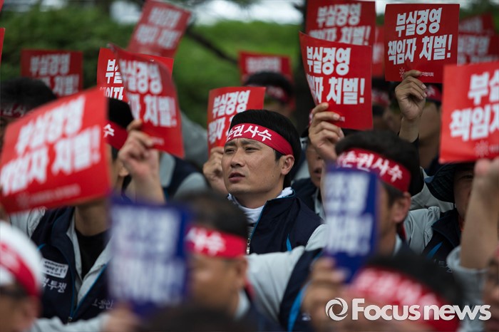 (서울=포커스뉴스) 13일 오전 서울 여의도 산업은행 본점 앞에서 삼성중공업 노동자협의회 관계자들이 고용안정 요구 및 정부의 조선업 구조조정을 규탄하는 상경 집회를 하고 있다.