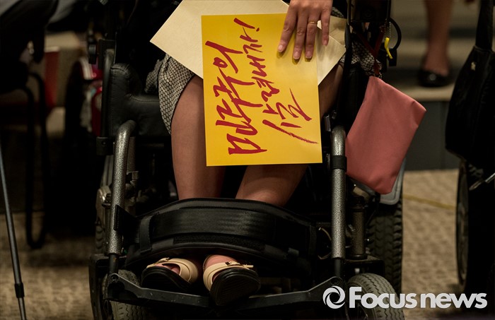 (서울=포커스뉴스) 13일 오전 서울 중구 프레스센터에서 열린 '한상균을 석방하라, 민주주의 살려내자' 7.13 시국회의에서 한 참석자가 '민주주의 살려내자' 구호가 적힌 손팻말을 들고 있다.