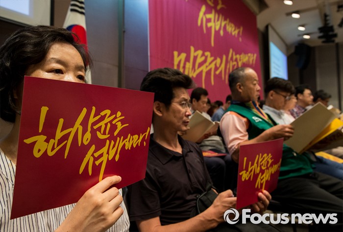 (서울=포커스뉴스) 13일 오전 서울 중구 프레스센터에서 열린 '한상균을 석방하라, 민주주의 살려내자' 7.13 시국회의에 참석한 시국선언인단이 한 위원장의 석방을 요구하는 손팻말을 들고 있다.