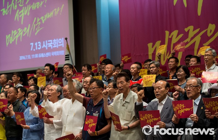 (서울=포커스뉴스) 13일 오전 서울 중구 프레스센터에서 열린 '한상균을 석방하라, 민주주의 살려내자' 7.13 시국회의에 참석한 시국선언인단이 구호를 외치고 있다.