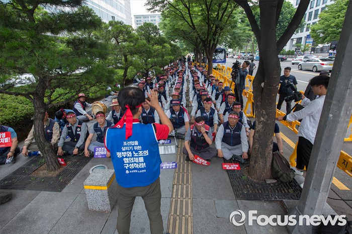 (서울=포커스뉴스) 13일 오전 서울 여의도 산업은행 본점 앞에서 삼성중공업 노동자협의회 관계자들이 고용안정 요구 및 정부의 조선업 구조조정을 규탄하는 상경 집회를 하고 있다.