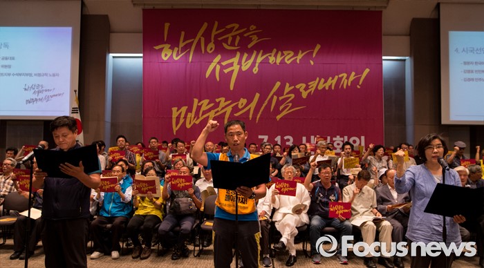 (서울=포커스뉴스) 13일 오전 서울 중구 프레스센터에서 열린 '한상균을 석방하라, 민주주의 살려내자' 7.13 시국회의에 참석한 시국선언인단이 시국선언문 낭독 후 구호를 외치고 있다.