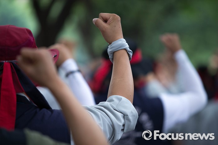 (서울=포커스뉴스) 13일 오전 서울 여의도 산업은행 본점 앞에서 삼성중공업 노동자협의회 관계자들이 고용안정 요구 및 정부의 조선업 구조조정을 규탄하는 상경 집회를 하고 있다.