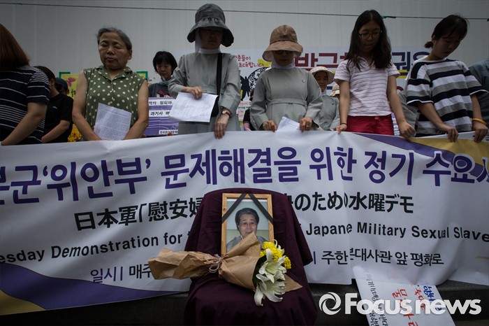 (서울=포커스뉴스) 13일 오후 서울 종로구 주한일본대사관 앞에서 일본군 '위안부' 문제 해결을 위한 제1239차 정기 수요집회가 열리고 있다. 지난 10일 세상을 떠난 고 유희남 할머니의 영정사진이 집회 앞 자리에 놓여져 있다.